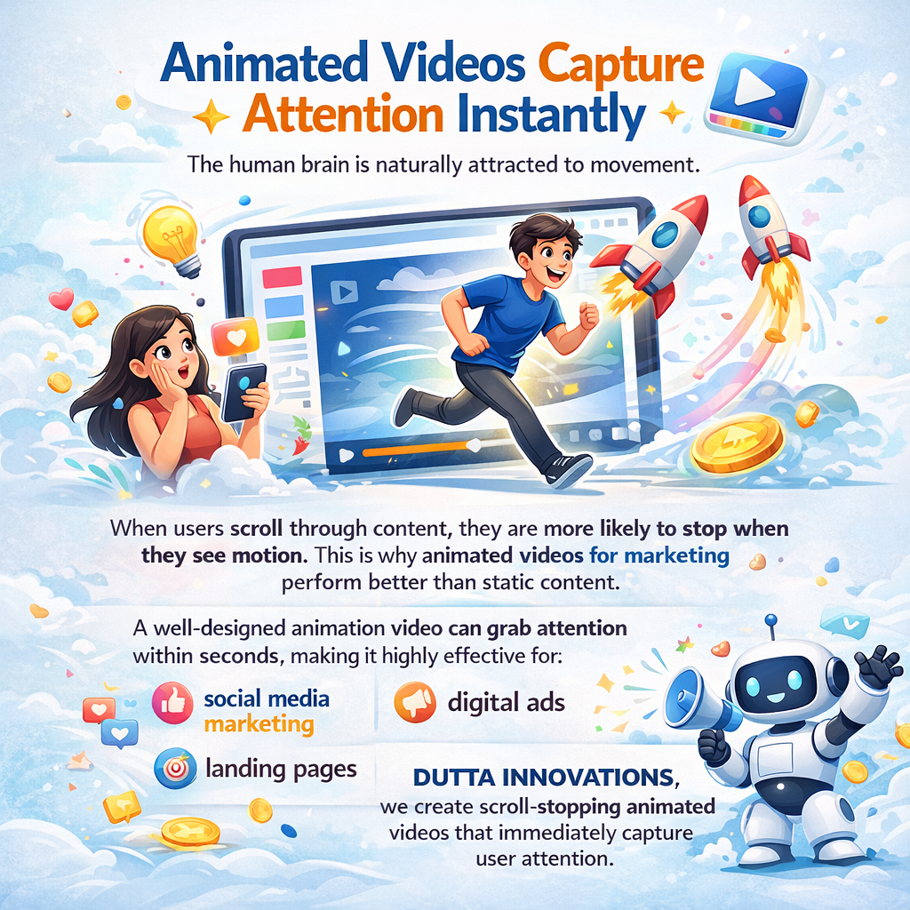 At DUTTA INNOVATIONS, we create scroll-stopping animated videos that immediately capture user attention.